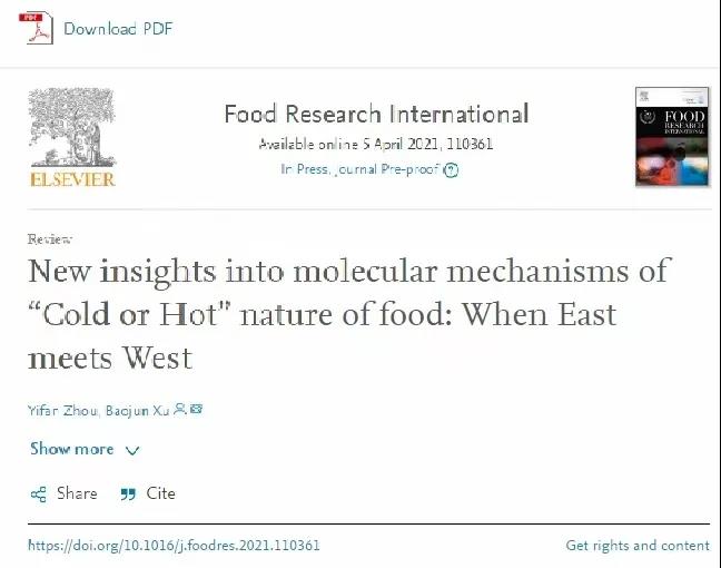 2021年,周一帆以第一作者身份在食品科技和工程技术方面的国际知名期刊Food Research International在线出版论文《有关于食品寒热性的新见解:当东方遇见西方》,这也是周一帆第一次发表SCI论文。食品科学与工程专业课程主任徐宝军教授为论文通讯作者。